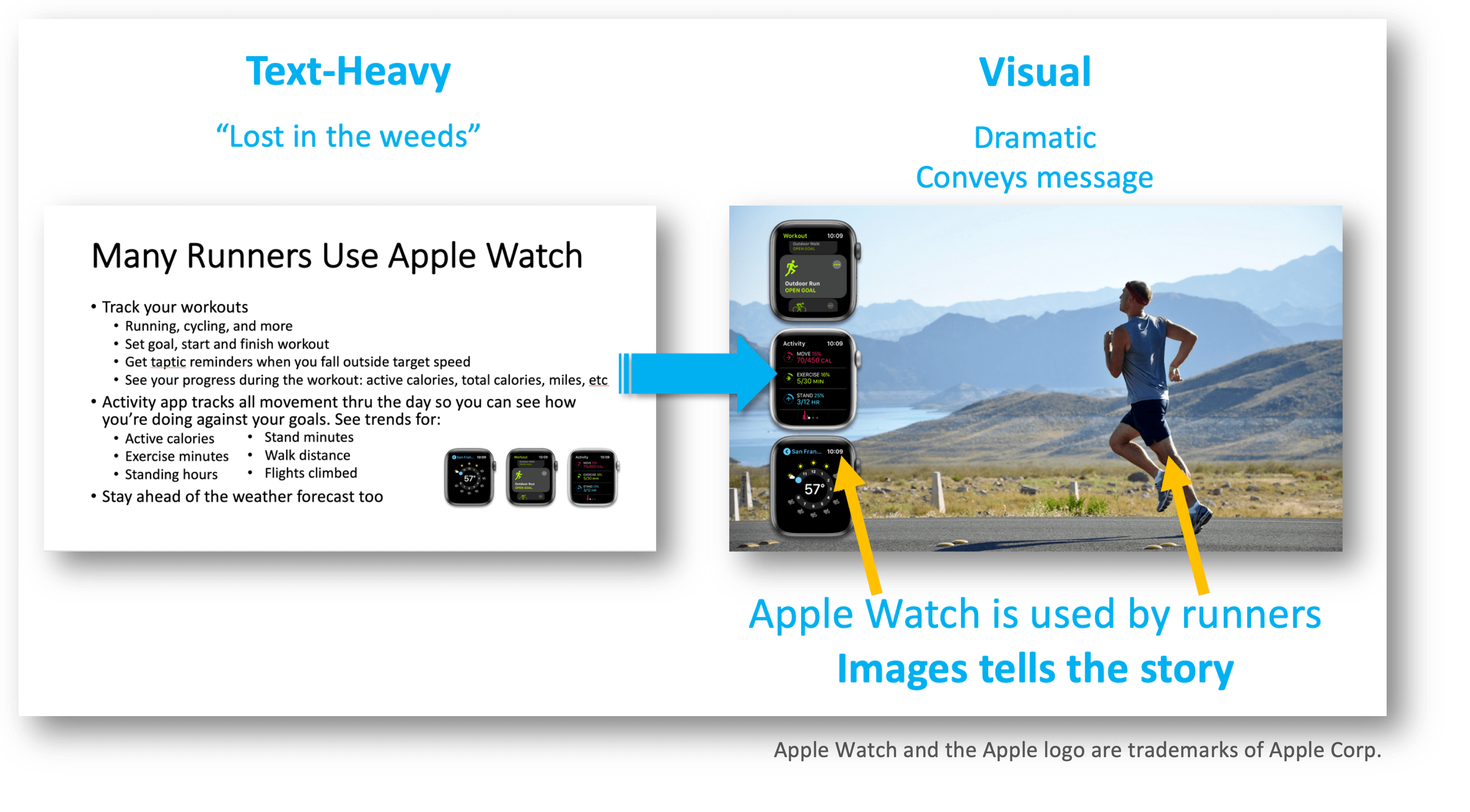 Taken alone, the slides show that Apple Watch is used by many different types of people such as runners, executives, hikers, the elderly, teenagers, travelers, and commuters. And they use Apple Watch in all sorts of ways – from tracking fitness to keeping in touch, to emergency alerts. Each slide clearly shows the type of user and some of the ways they might use the watch.